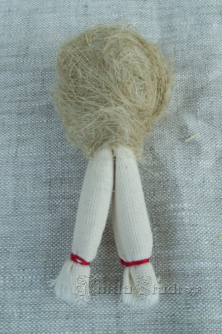 Теперь берем пучок льняного очеса, который у нас получился в одну руку, а в другую - нашу куклу: