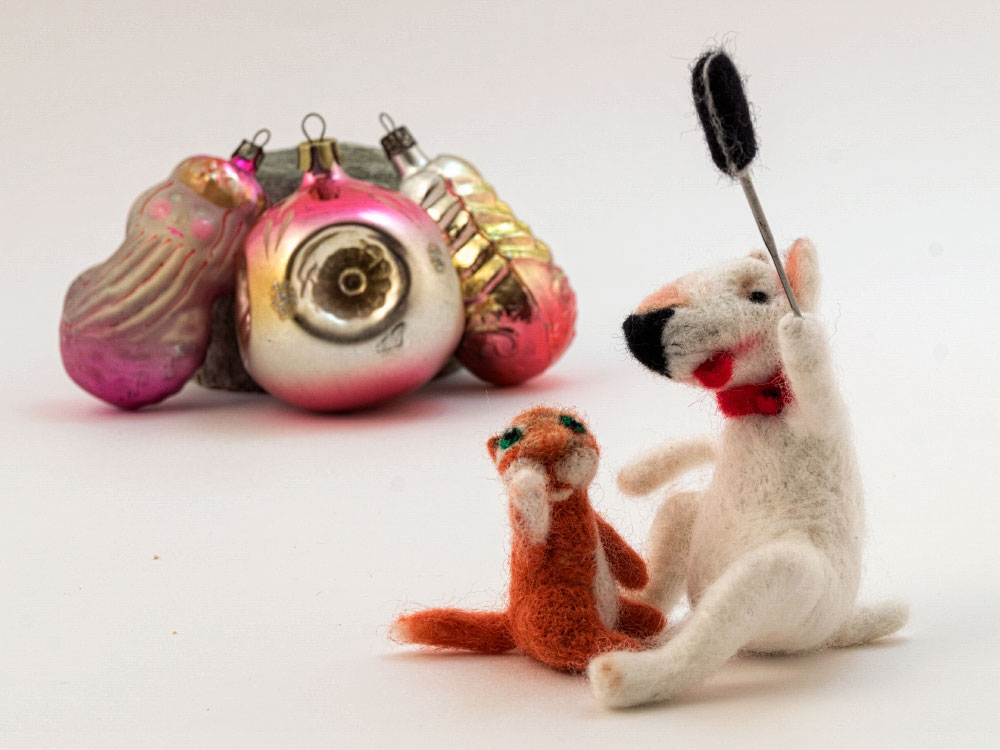 Булька и Рыжий – это интерьерные куклы, изготовленные из шерсти методом сухого валяния. Выдающиеся (в буквальном смысле) части тела, а именно - лапы и хвосты сваливались на проволочном каркасе, что позволяет слегка изменять их положение, регулируя позу кукол в целом.